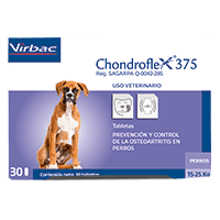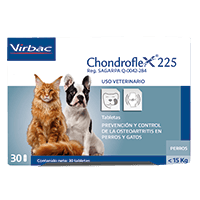 Chondroflex ® está indicado como auxiliar en el tratamiento de la osteoartritis en perros y gatos de razas susceptibles, pacientes geriátricos o con obesidad. El sulfato de condroitina es un constituyente de la estructura cartilaginosa. El quitosán, es un precursor de la glucosamina que forma parte de la composición del cartílago. Además ejerce un efecto protector sobre la condroítina sulfato, evitando su degradación en el tracto digestivo facilitando su absorción intestinal.